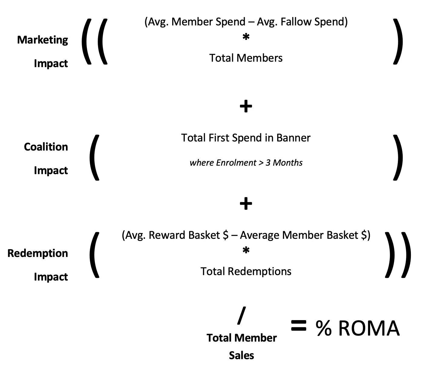 To calculate ROMA then, we take these three different measures and the total incremental sales lift attributed to each, and then express this as a percentage of member sales.